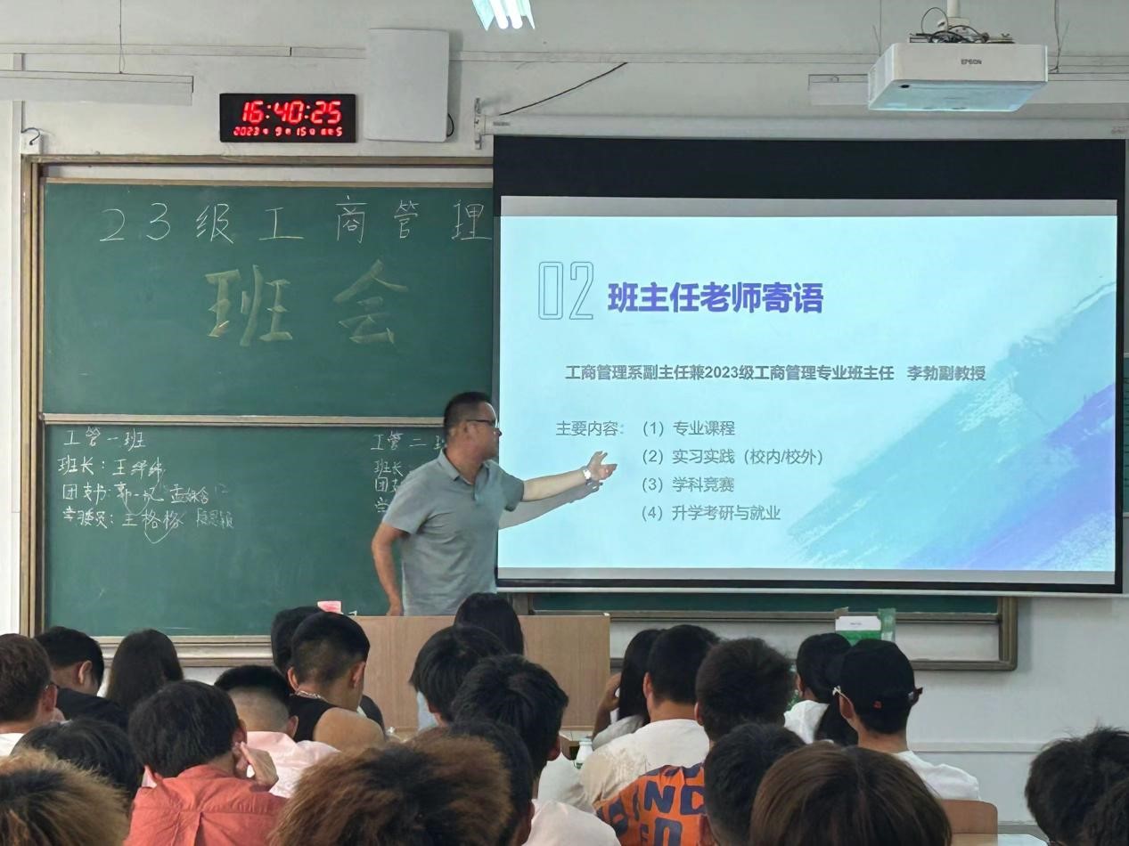 2.学习规划。李勃老师就专业课程、实习实践(校内/校外)、学科竞赛和升学考研与就业四个方面为专业同学的大学生活做了整体规划。李勃老师指出,工商管理专业毕业生就业与升学考研竞争激烈,叮嘱在新生应该认真学习专业课程,扎实基础,多参加校内外实习实践和学科竞赛,增强自己的核心竞争力能力。