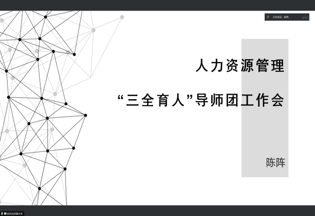 10月26日,刚刚完成换届的人力资源管理“三全育人”导师团于线上召开了第一次工作会,由人力资源管理专业陈阵老师主持,导师团全体成员参加。为积极贯彻落实习近平总书记在全国教育大会上提出的“培养德智体美劳全面发展的社会主义建设者和接班人,加快推进教育现代化、建设教育强国、办好人民满意的教育”,会议从导师团简介、运行模式和工作要求等三个方面展开。