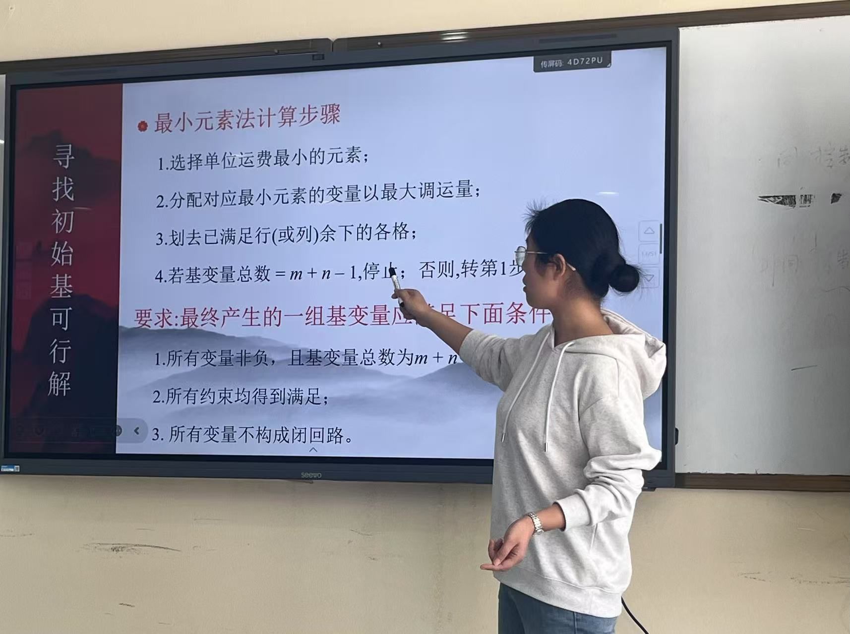 王渊副院长从教学内容逻辑、思政元素融合、师生互动设计、教态语言规范等维度逐一点评。他强调:“运筹学课程要克服日常偏重方法讲解的讲课习惯,教学竞赛需兼顾‘深度’与‘温度’,既要体现学科前沿性,又要通过实例问题提出-解题方法介绍-方法在实例中的具体应用这一情境化案例引发评委共鸣。”