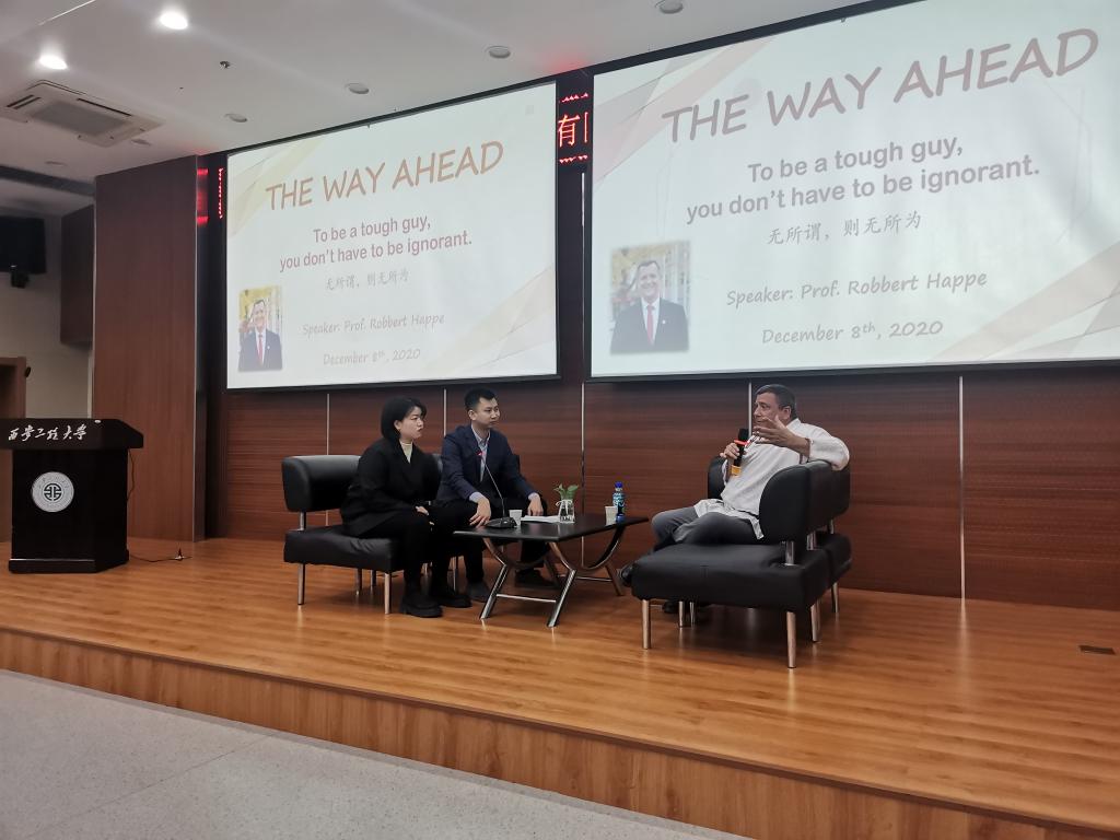 在访谈交流环节,同学们踊跃互动,提到了如何提高英语能力、面对丰富的校园活动应该如何选择和协调时间,以及职业生涯规划等问题,Robbert对大家的提问逐一进行了细致解答。他表示英语学习是至关重要的,这不仅是一种语言能力,更意味着在机遇面前的竞争力和拓展全球视野的能力。同时,他鼓励同学们抓住学习机会,提升专业知识和专业技能,不断充实自己,提高自我独立意识和创新能力,在众多选择面前做好决策,为成为一名优秀的管理者做好知识储备和思想沉淀。