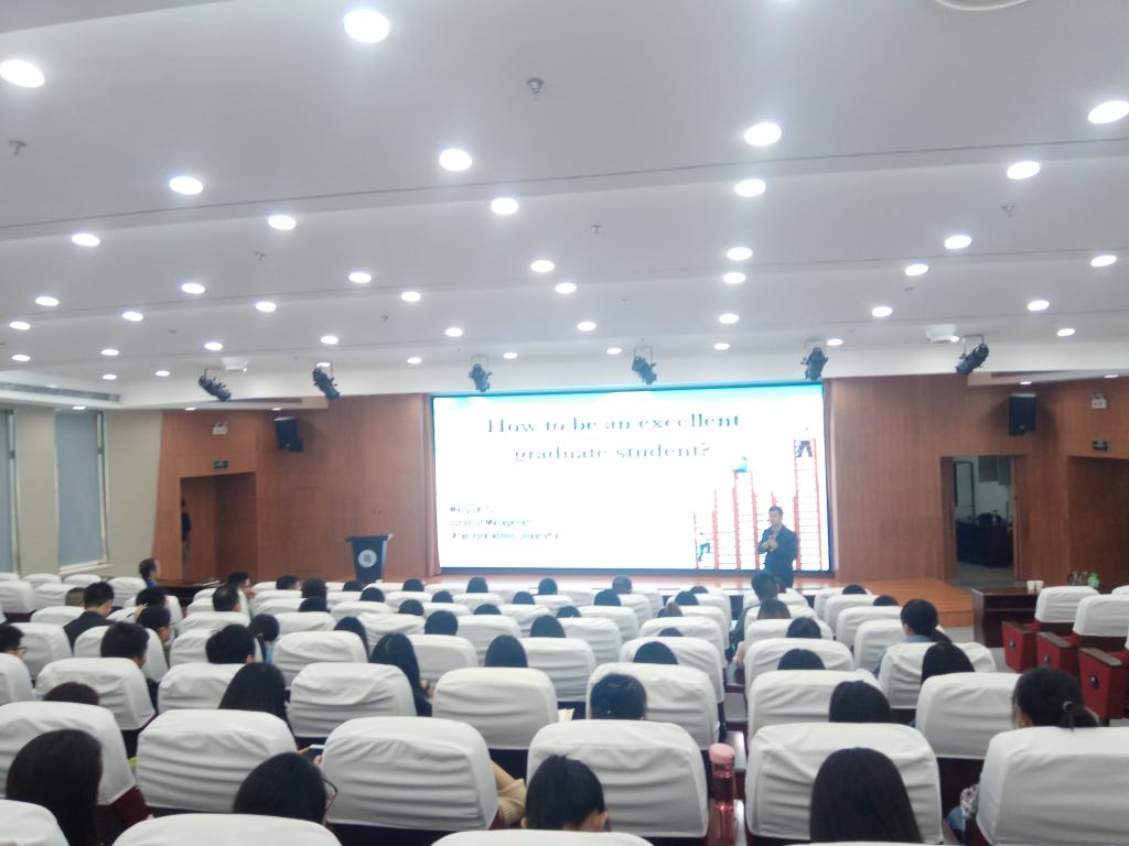 王进富从“什么是研究生”、“怎样使自己更优秀”、“自我定位”、“选定目标,立即行动”四个方面阐述了怎样成为一名优秀的研究生。报告中,王进富中英文融汇贯通,利用国内外案例分析,分享自身经验,理论联系实际,幽默风趣、深入浅出地为学院研究生上了精彩的第一课。他通过将研究生和本科生进行对比提出研究生学习生涯的特点,强调指出研究生阶段要注重学会阅读、善于思考、主动创新、坚持不懈、灵活变通、有效沟通、科学规划、表达自我等各方面能力的培养,他鼓励研究生要树立自信、正确定位、自我更新,确定目标,最重要的是付诸行动。他希望学院研究生既要脚踏实地,又要仰望星空,尽自己所能,在实践中求真知,实现自我价值。