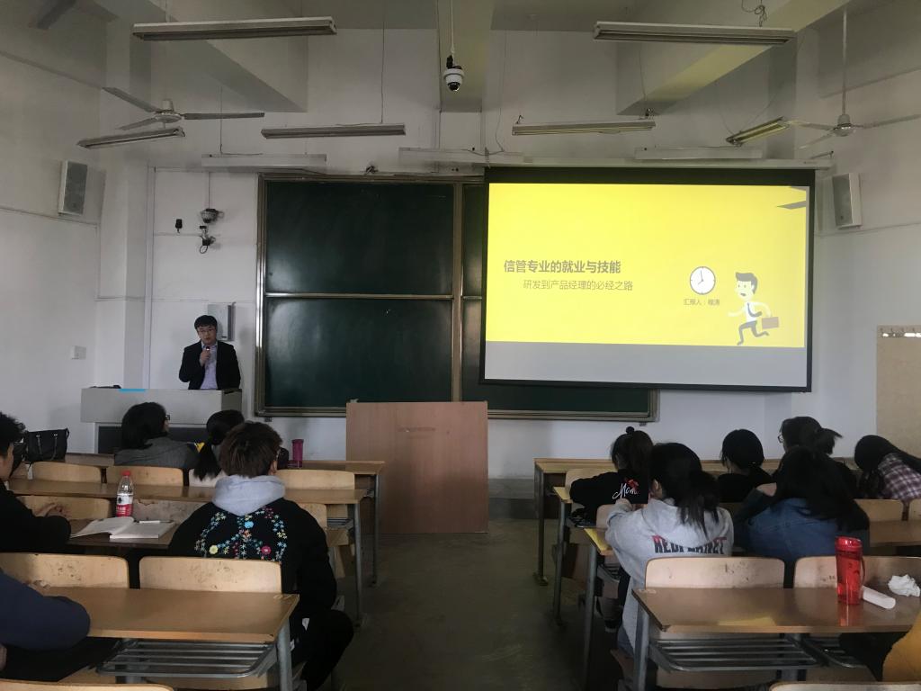 信管专业“学长有话说”系列讲座旨在帮助在校学生更好地了解自己的专业,了解市场对专业的能力需求及语言能力、团队能力、领导能力、管理能力等其他方面能力的需求,更早的明确自己的发展方向和目标,在学校生涯中有规划的发展自己的核心能力,为今后的成长打下宽广且坚实的基础。(撰稿:陈立军 审核: 徐焕章 王渊)