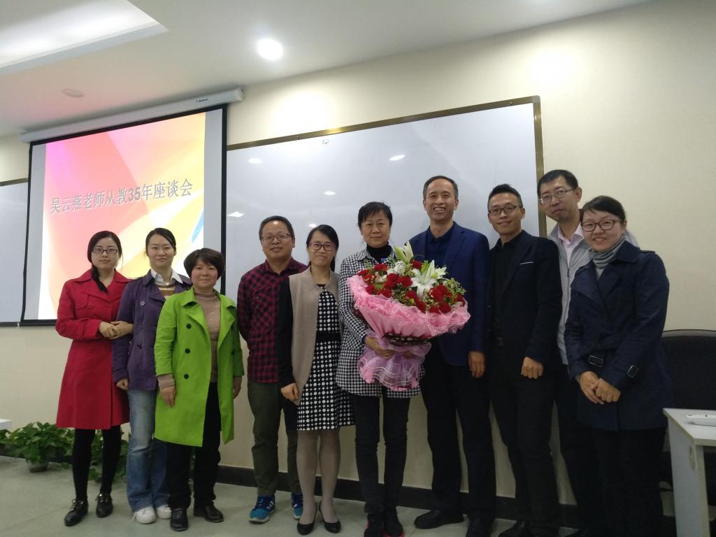 座谈会结束时,与会人员与吴云燕老师合影留念,热烈而真诚的荣休座谈活动为吴云燕老师的教育教学生涯画上了圆满的句号。祝愿吴云燕老师芳华永驻,祝愿她退休后的生活多姿多彩,顺心顺意!
