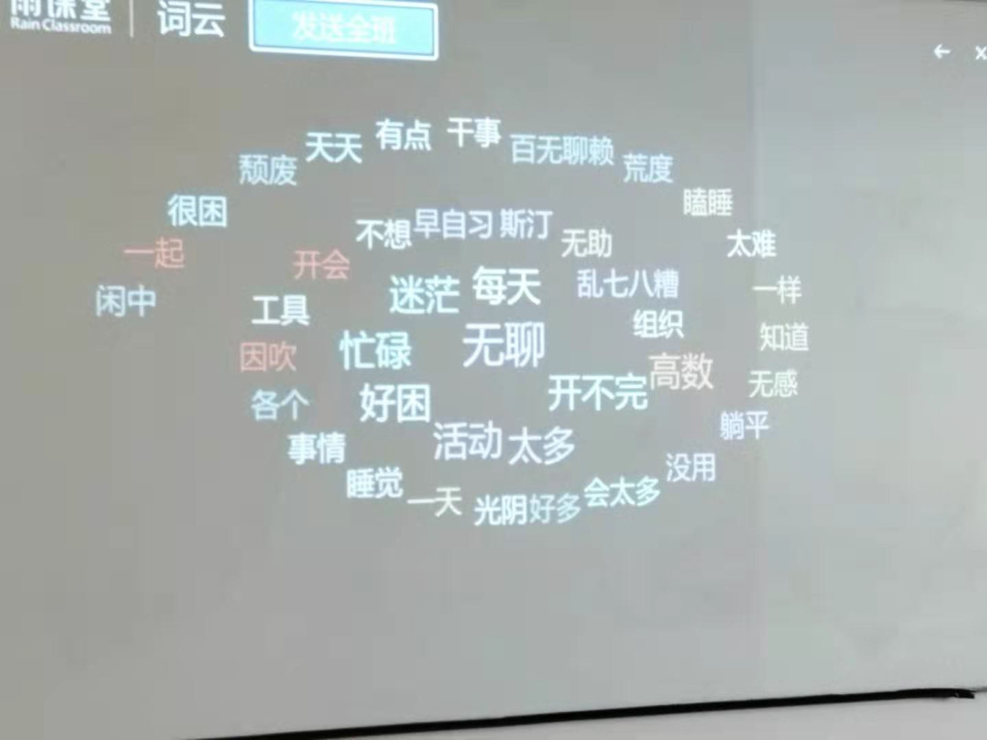 在讨论环节,同学们将自己从进入大学到现在为止的感受发送雨课堂弹幕,在关键词展示出来后给予大家相应的引导。热词多围绕“无聊、迷茫”等词语展开,反映了同学们从高中的紧张生活过渡到大学阶段的自主学习存在的心理状态和问题。张正林结合自己的大学经历就这些状态和问题与大家进行了深入的沟通,介绍了相关的应对策略,给予同学们积极的指导和帮助。