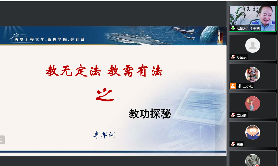 2022年5月7日晚19时,由taptap188会计系主办的“教无定法 教需有法”系列活动的第一讲正式开讲,会计系主任王小红老师主持,会计系全体教师及其他系部分教师参与,这第一讲由taptap点点188资深教授李军训老师围绕“如何上好一堂课”进行“教功探秘”,为老师们倾情奉献了自己从教三十几年的教学经验和总结。