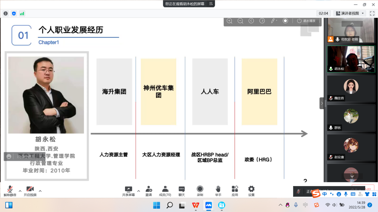 为充分发挥学院优秀校友作为就业典型的引领示范作用,增强行政管理专业学生的职业意识,帮助即将求职的同学指明方向,解决同学们关于企业部门求职存在的疑难问题,2022年5月28日下午,行政管理专业三全育人导师团采用线上会议的形式,开展了“学长有话说——企业部门求职与职业发展”经验交流会。参加本次活动的有行政管理系主任、导师团副团长张群林,导师团教师苟欢迎以及行政管理专业在校学生。本次邀请到的主讲人是行政管理2010届毕业生、阿里巴巴政委胡永松,会议由导师团教师苟欢迎主持。