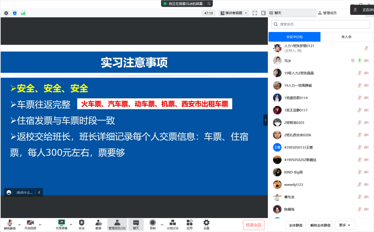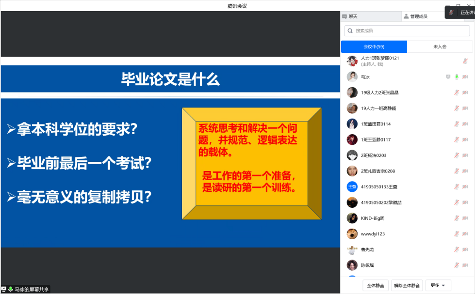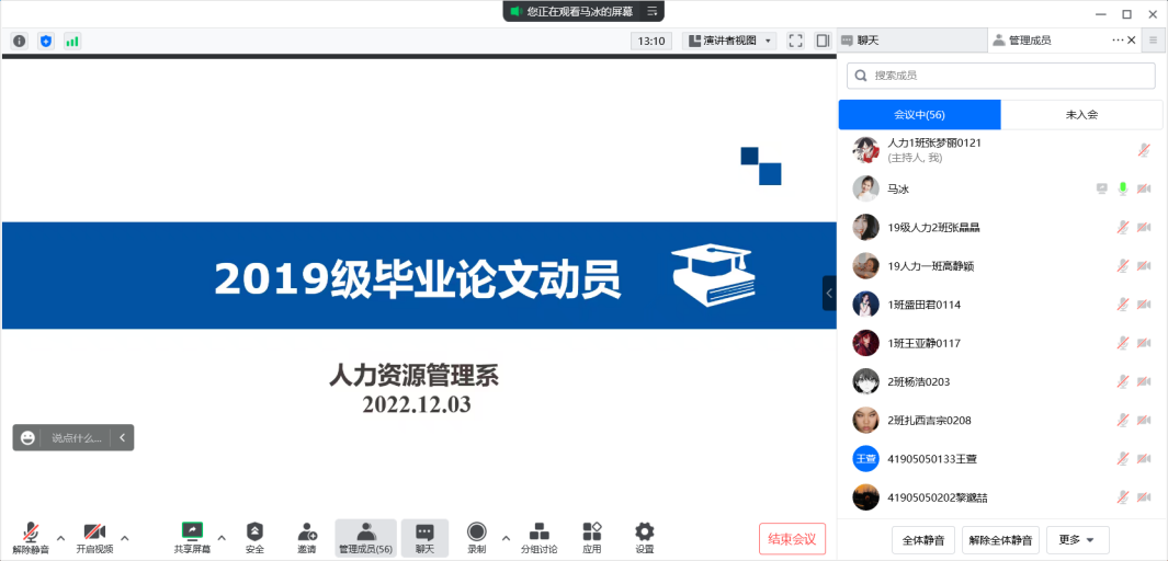为切实做好人力资源管理专业2019级本科学生的毕业论文及毕业实习工作,确保毕业论文、实习、就业等工作如期进行,促进学生顺利毕业、就业,12月3日晚19:00,2019级人力资源管理专业本科毕业生毕业论文及毕业实习动员大会于通过腾讯会议召开,系主任马冰老师主持会议,全体学生参加会议。