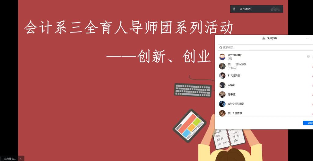 2022年12月1号早上8:00~10:00,会计系开展2022级三全育人导师团系列活动之创新创业在线上举行,2022级会计学1-2班全体同学参加,本次活动由会计系雷雷老师主持。