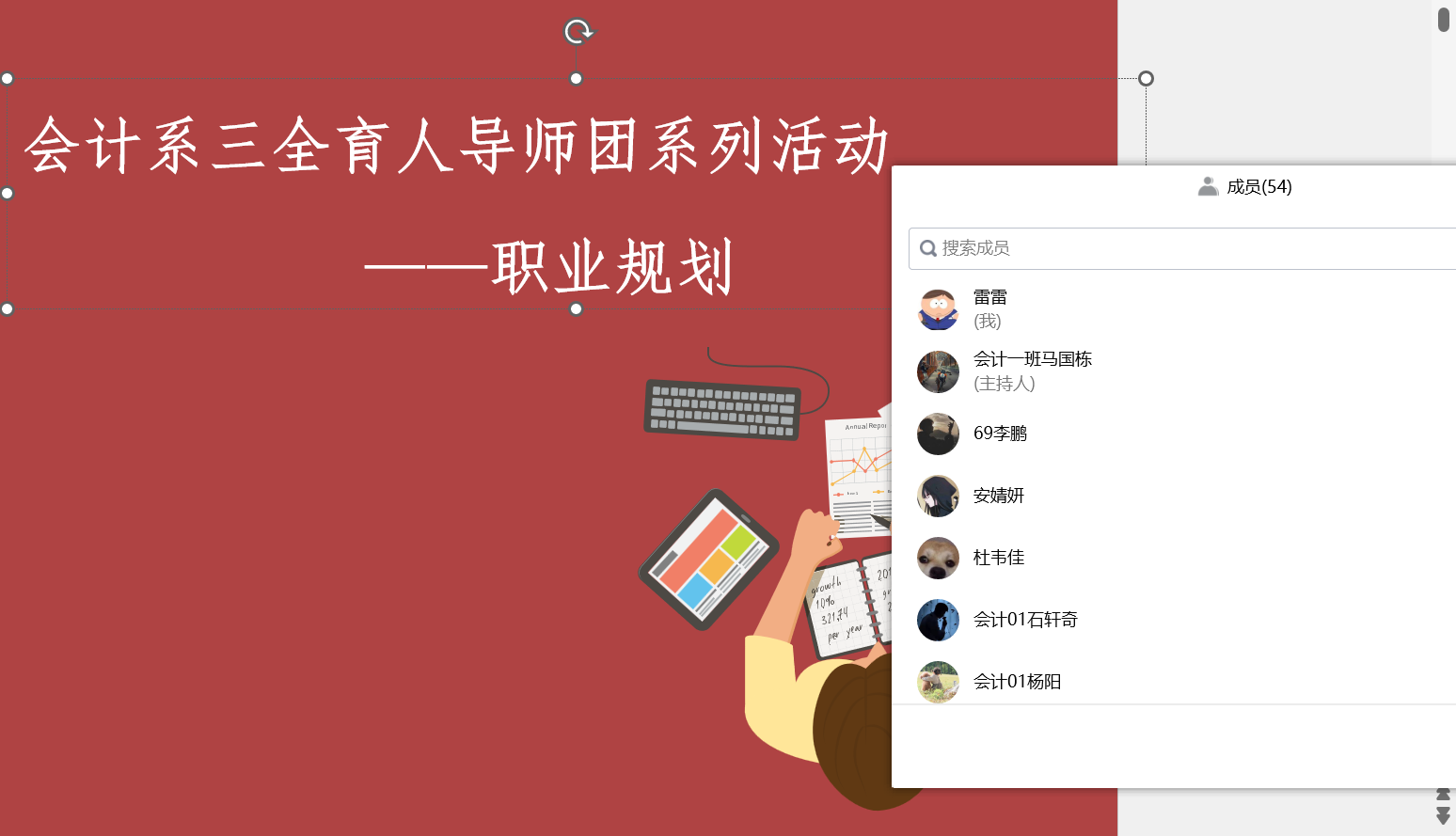 2022年12月8日8点,本次“会计专业三全育人导师团系列活动——职业规划”在线上进行,本次活动由宋玉老师和雷雷老师主持,会计2201-2202班学生参加。