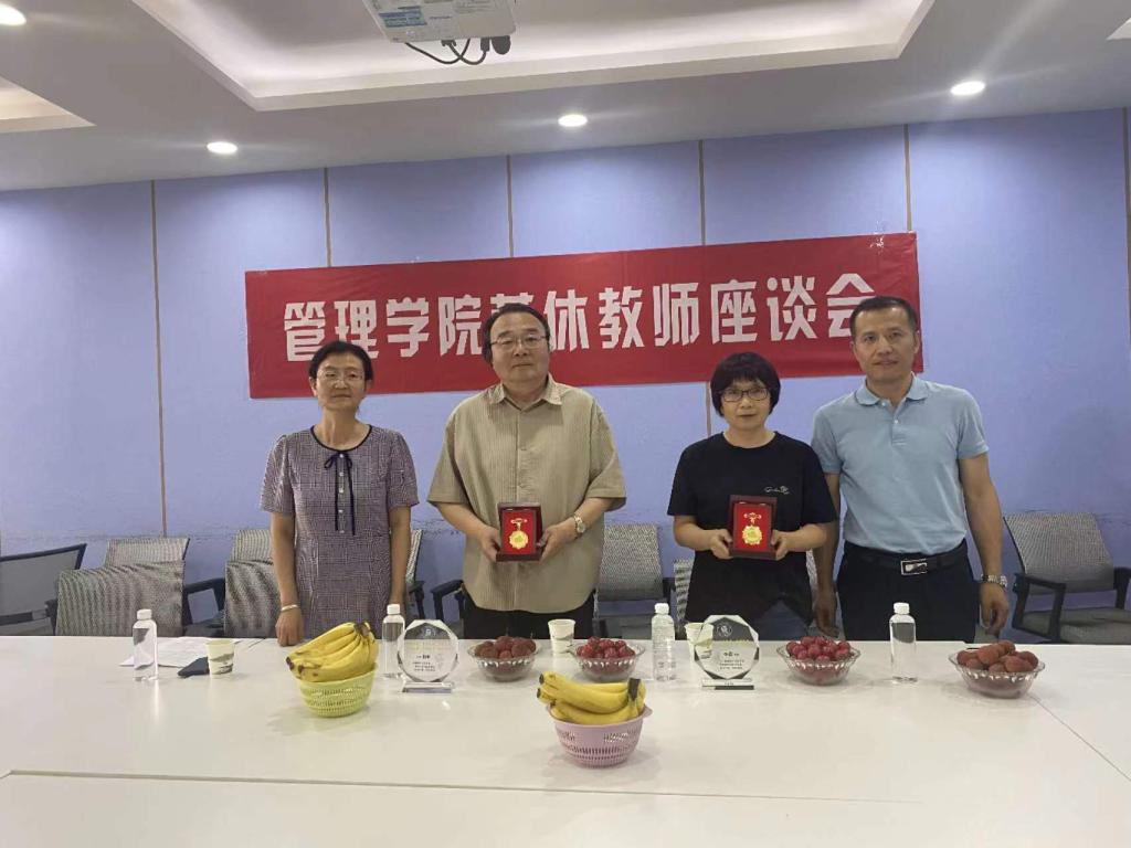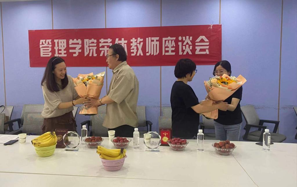 王爱华、代锴分别向两位教师颁发荣休纪念杯和从教三十年荣誉勋章。王宁和吕英娜代表学院工会为两位教师敬献鲜花。工商管理系党支部书记杨静、青年教师代表李勃为两位老师送上纪念品。