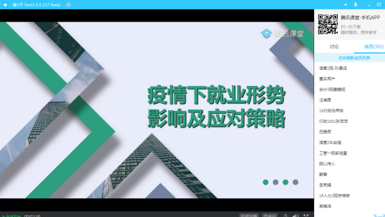 报告开始, 尹老师表示如何在家完成毕业论文(毕业设计),成为毕业生热点关注的话题之一。在历时一个多小时的报告中,尹老师旁征博引、娓娓道来,用生动形象的PPT,向同学们讲解了有效检索和利用图书馆文献信息资源的技巧。报告从人文社科毕业论文与文献资源利用的关系;如何检索利用电子信息资源进行论文写作;如何撰写符合规范的本科学士学位论文;联系我们-论文写作辅导与资料查询帮助四个方面展开。着重向学生讲解了如何高效利用图书馆资源,顺利完成毕业论文写作。 接着,刘佳通过大量的数据,就近年来全国毕业生人数及就业形势、疫情下就业形势进行了直观且详细的分析,为毕业生推荐了很多就业平台和网站,供大家参考。刘老师针对网络面试中可能遇到的问题提出了几点应对策略,并结合具体案例,为毕业生讲述了用人单位招聘流程、投递简历技巧等。刘老师在报告中提醒同学们,今年毕业生的增加、再加上受疫情影响很多企业缩减招聘计划导致职位竞争加剧,毕业生们应该调整心态,把握机会,认清形势、明确自己的求职方向、好好利用疫情宅家的时间努力做好求职前的准备,积极主动地投入到就业求职工作中,同时学校就业指导中心也全天为大家提供线上指导和解答。