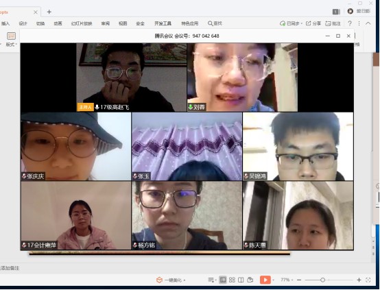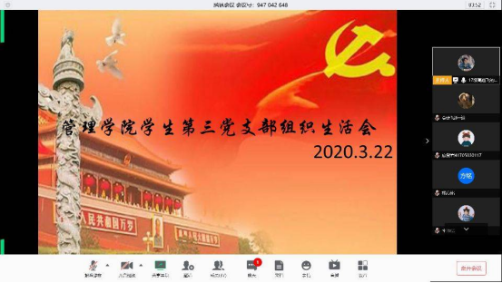 最后,支部书记刘蓉强调,在马上看到疫情散去的曙光时,各位同学更要自律,不给国家添乱。在家积极调整状态,为开学做准备。大四的同学要调整状态,在做好毕业准备的同时,不能等、靠、要,积极参加线上招聘会;大三的同学要根据学校“停课不停学”的安排,保质保量地完成线上学习。通过这次疫情,让我们更加体会到了祖国的强大,青年学生要把自己的命运和祖国的命运联系起来,努力学习建设祖国的本领,将来成为国家的栋梁之才。