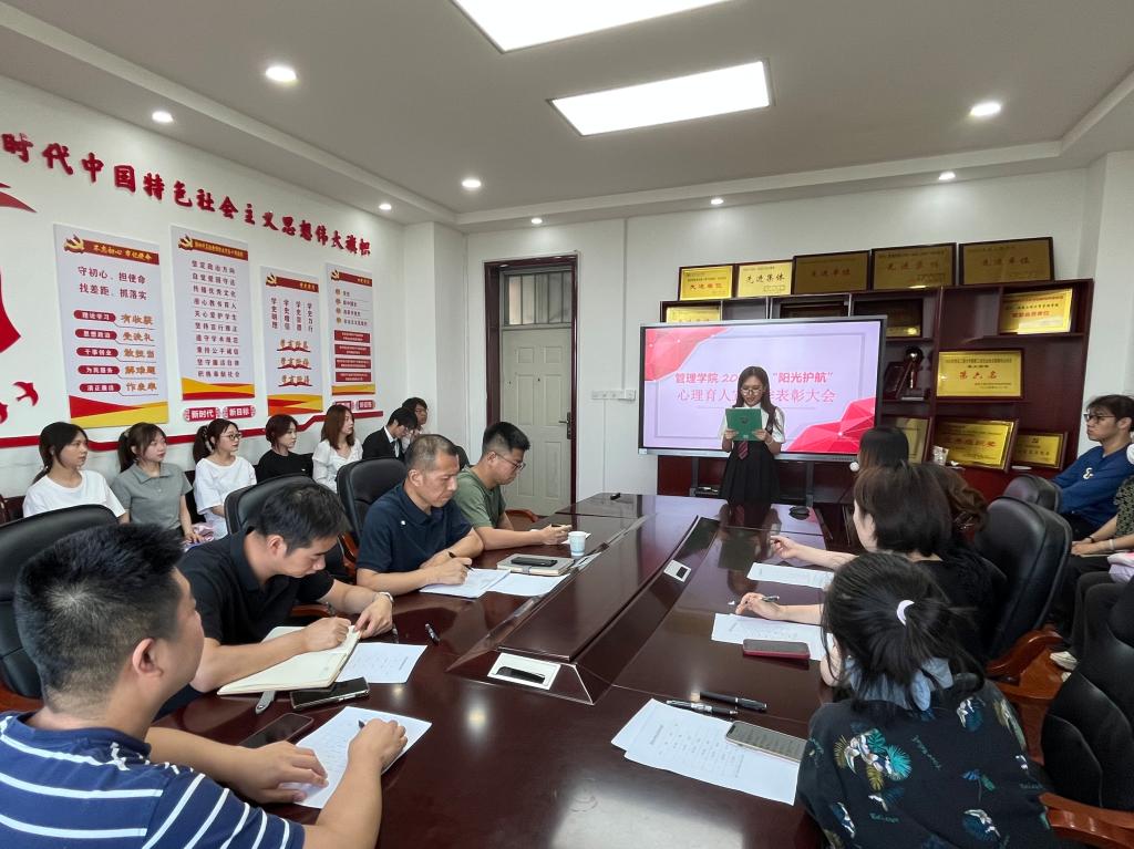 2023年6月14日下午16时,taptap点点188在人文楼311会议室召开2023年“阳光护航”心理育人宣传季表彰大会。学院党委副书记代锴,学生工作办公室全体辅导员出席并担任评委,听取优秀心理委员和育心优秀班级入围者的汇报答辩。