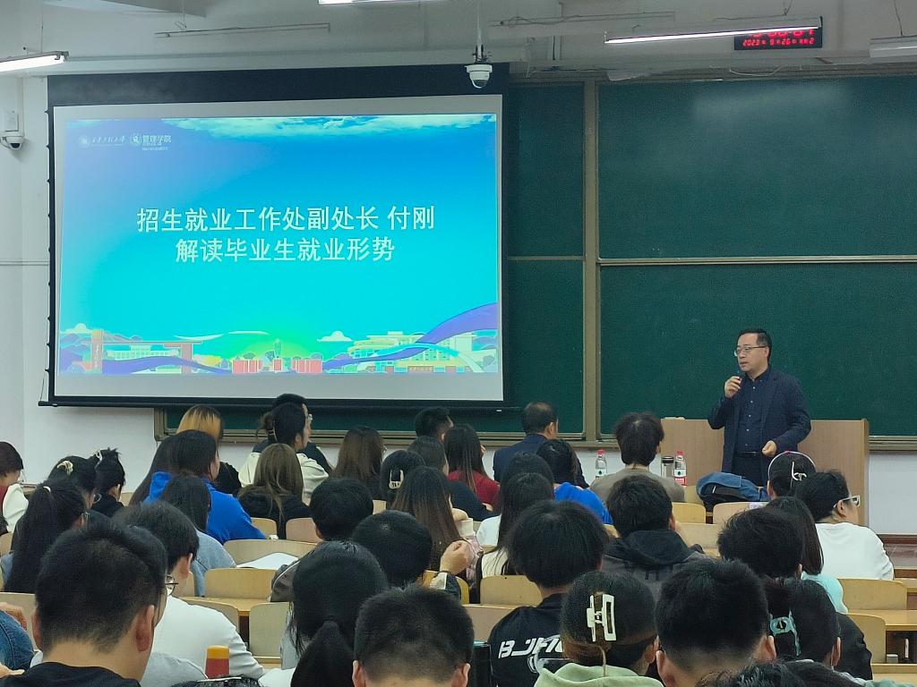 付刚从就业现状、招聘趋势、就业心态、影响大学生成功就业的主要因素等方面为毕业生分析了当前就业形势,并详细梳理了毕业生在体制内、国企、民营企业、外企就业及服务西部、参与乡村振兴等各类就业选择中存在的优势和劣势,帮助同学们更好地了解目前的就业环境,他鼓励学生要积极应对就业压力,把握就业机会,最终找到自己心仪的工作。