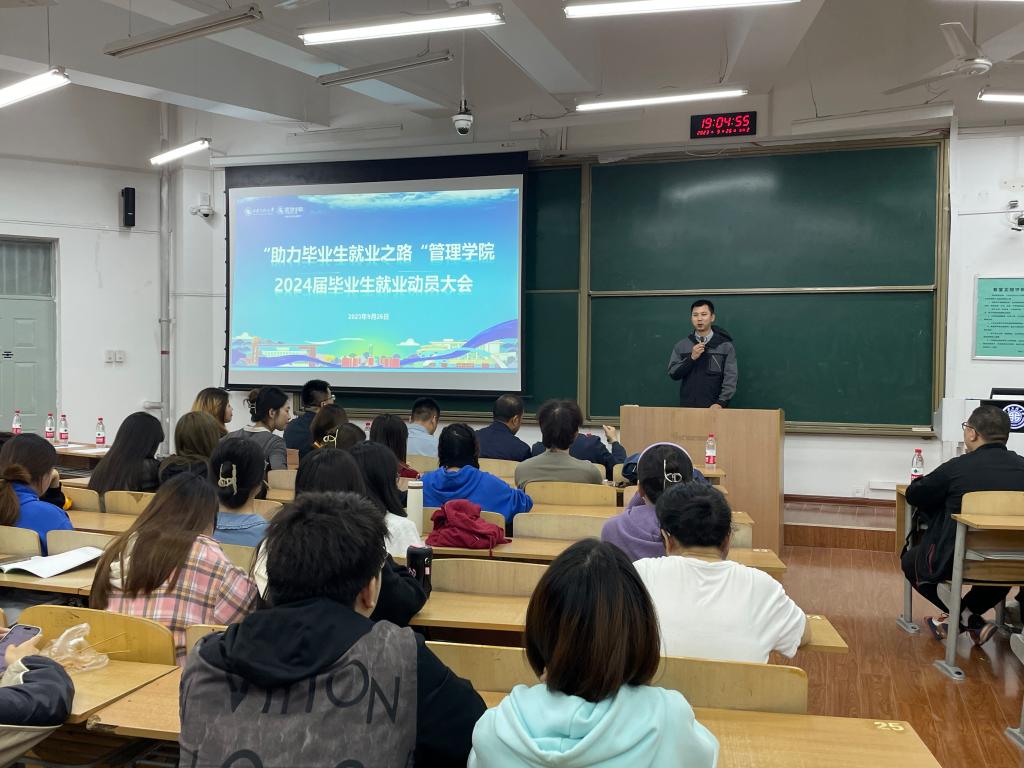 为引导毕业生树立积极的就业观和择业观,同时给毕业生提供分类就业指导,助力毕业生顺利步入职业生涯,9月26日晚,taptap点点188在教学楼B233教室举办“助力毕业生就业之路”——2024届毕业生就业动员大会,邀请学校招生就业工作处副处长付刚、学院研究生秘书黄鹏飞及合作企业代表到场帮助学生分析就业形势与政策、讲解研究生招考信息,解读银行和国企招考情况,同时邀请2022届校友代表孙静怡和2024届已签约学生代表魏柏奕分享工作体会和应聘经验,学院党委副书记代锴、就业辅导员张妍、2020级本科生辅导员陈钰娴,2024届本科和研究生毕业生约300人参加大会,研究生辅导员王志刚主持会议。