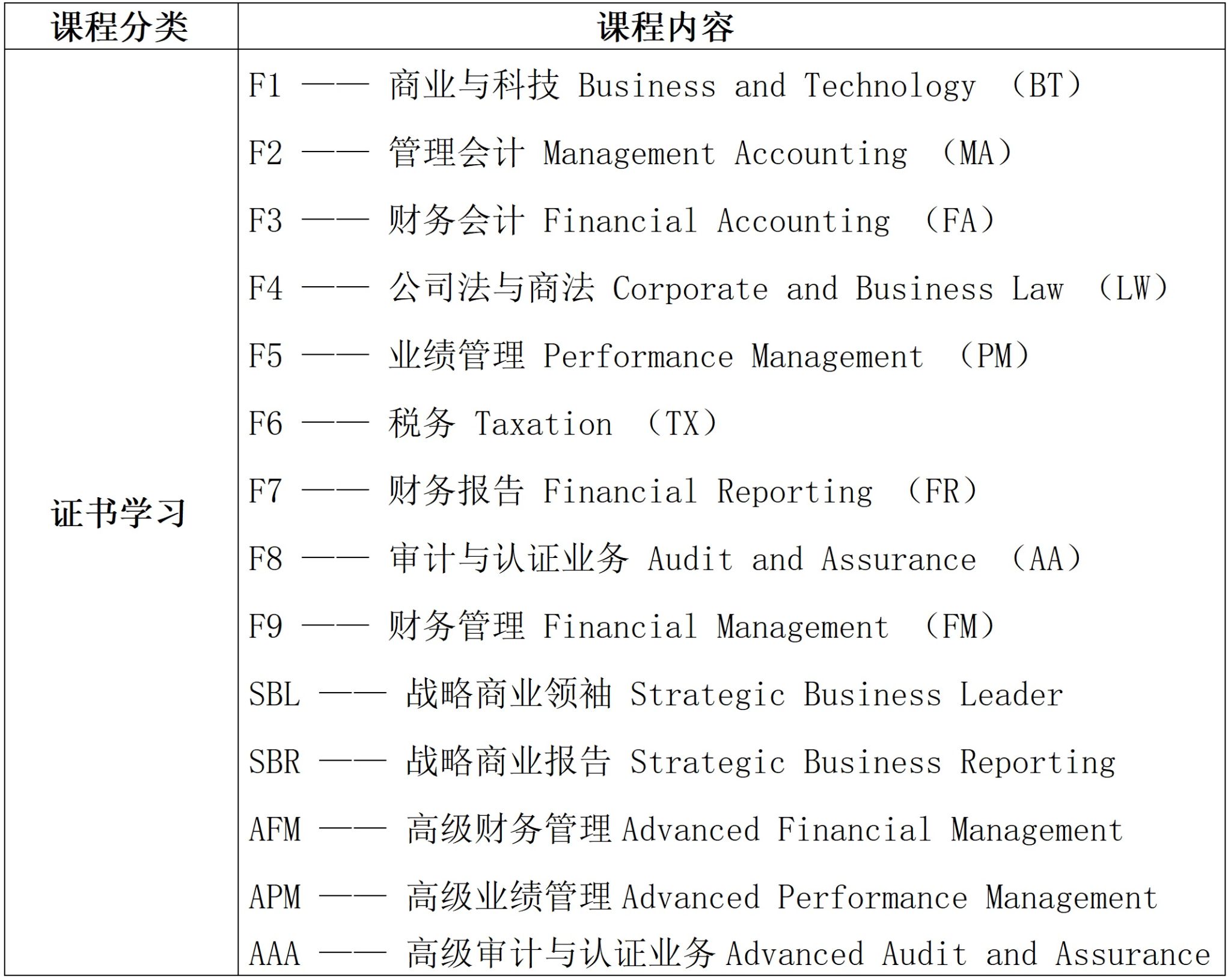 ACCA课程包含 13 门科目(商业与科技、管理会计、财务会计、公司法与商法、业绩管理、税务、财务报告、审计与认证业务、财务管理、战略商业领袖、战略商业报告、高级财务管理、高级业绩管理、高级税务、高级审计与认证业务(后四门选两门))的课程学习,以及财务英语前导课程、重难点串讲、复习冲刺课等。