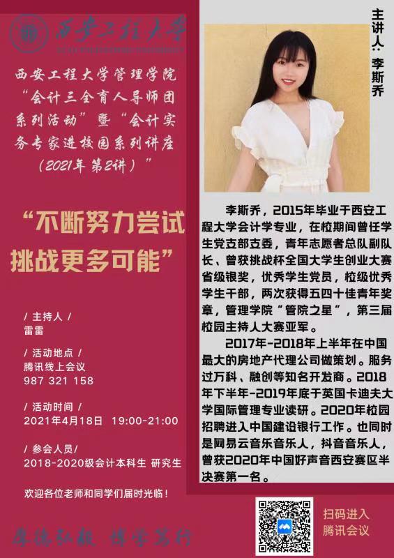 本次讲座邀请我校2015届会计学专业毕业生李斯乔作为主讲人,会计学专业2018-2020级学生参加了本次讲座。会上,李斯乔以“不断努力尝试,挑战更多可能”为主题,分享了她的求学之路、工作历程、出国经历及人生体悟。她表示,希望同学们能够珍惜大学时光,积极参加竞赛,多实践多锻炼,多结交良师益友,用课余时间培养爱好,增强自身综合素质,提升竞争力。