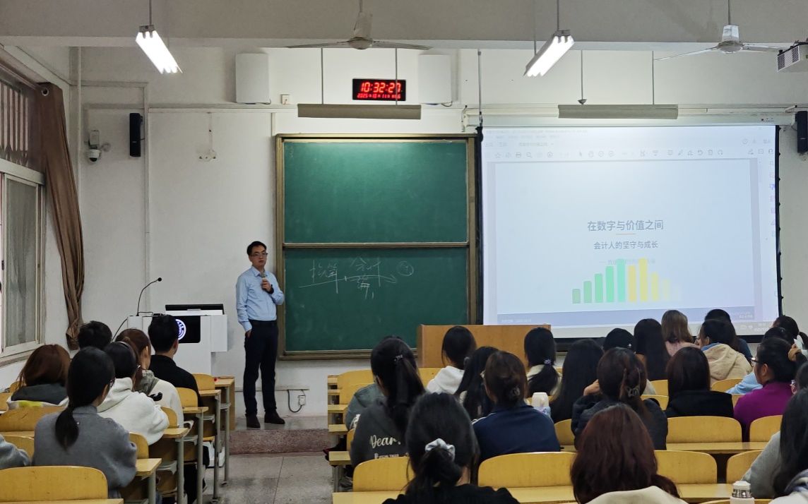 随后,张卫鹏董事长以《在数字与价值之间:会计人的坚守与成长——致逐梦财经的力量》为题分享。他从会计学科本质入手,打破传统认知,用生动比喻阐释会计核心价值,让师生(包括正面临就业选择的大四学生)对专业有更深刻理解。