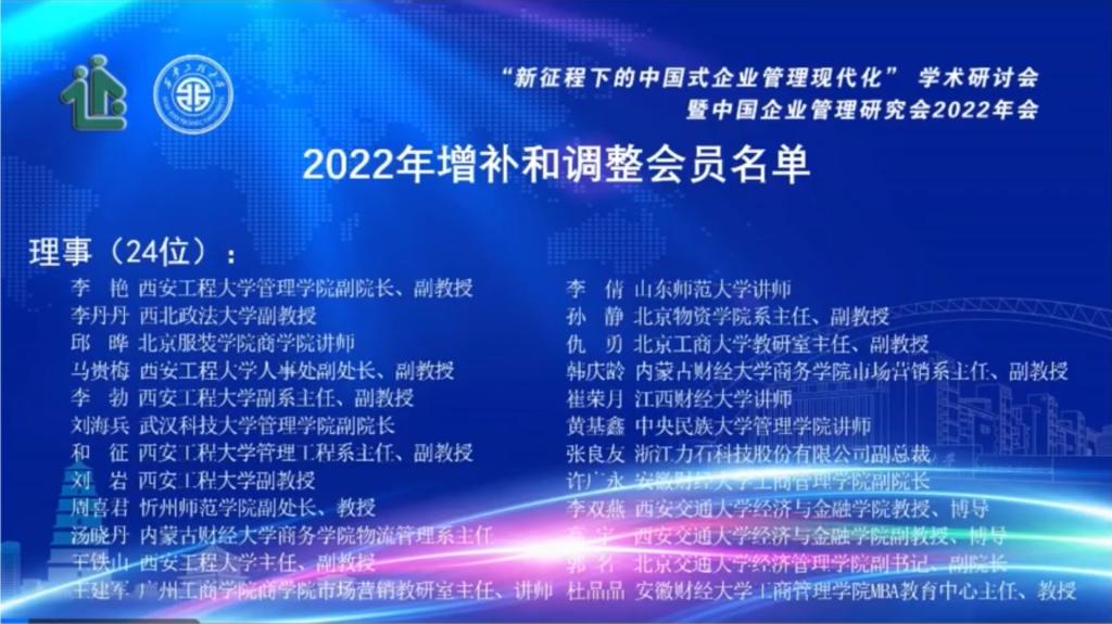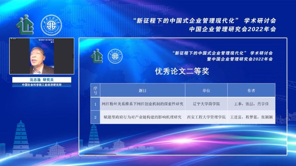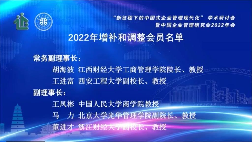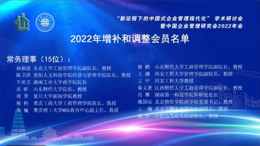 闭幕式上,中国社会科学院工业经济研究所研究员沈志渔还宣读了年会分论坛优秀论文名单。经过专家评审,甄选出7篇论文作为中国企业管理研究会2022年度优秀论文。其中,2篇论文荣获优秀论文二等奖,5篇论文荣获优秀论文三等奖。我校王进富、程梦蓝、张颖颖所撰写论文“赋能型政府行为对产业链构建的影响机理研究”获得优秀论文二等奖。中国企业管理研究会会长黄速建宣布了2022年研究会会员名单,我校副校长王进富教授当选常务副理事长,taptap点点188副院长王渊教授、王宁教授当选常务理事,马贵梅等6位副教授当选理事。至此,由我校主办、taptap点点188承办的“新征程下的中国式企业管理现代化”学术研讨会暨中国企业管理研究会2022年会圆满闭幕。