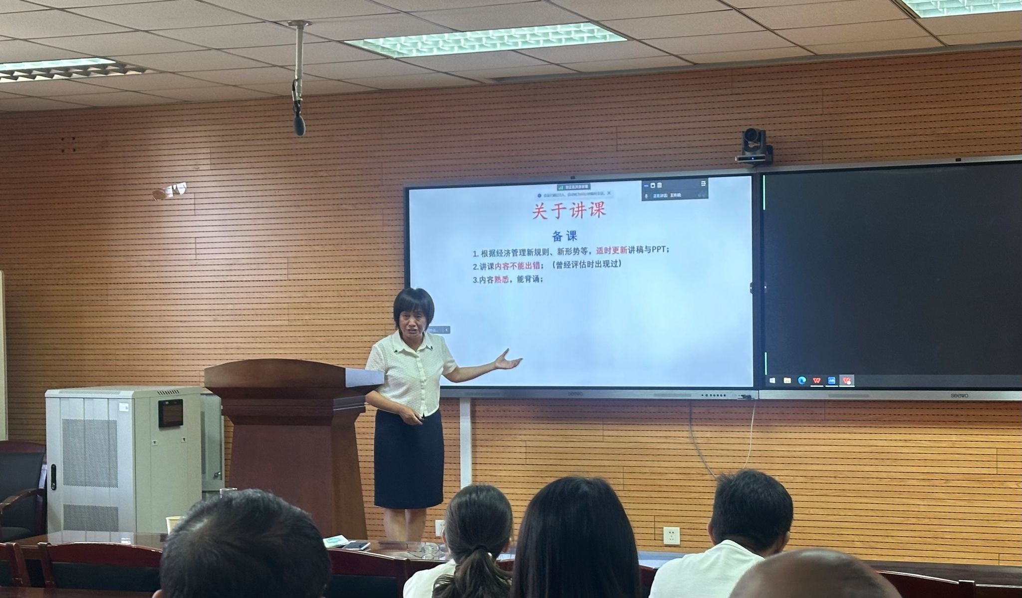 随后,徐玲向教师进行教学规范性培训。她从备课、课堂讲授、课后结课材料批阅及教学质量要求等方面,结合自身教学经验,以示例展示的形式,详细阐述了每项工作的重点注意事项及规范性要求。特别是对于教师的课前准备工作,着重强调了“细节”的重要性和必要性。徐玲指出,备课是教学的基础,只有充分备课才能确保课堂教学的顺利进行;课堂讲授要注重启发式教学和互动式学习,激发学生的学习兴趣和积极性;课后作业批阅则是教学的延伸,要及时反馈学生的学习情况,帮助学生查漏补缺。徐玲还从备课材料及课堂教学设计等方面分享了自己多年的教学经验和心得,教师们纷纷表示受益匪浅。