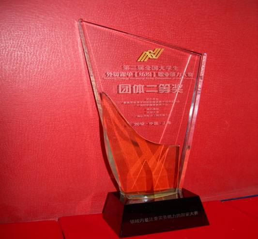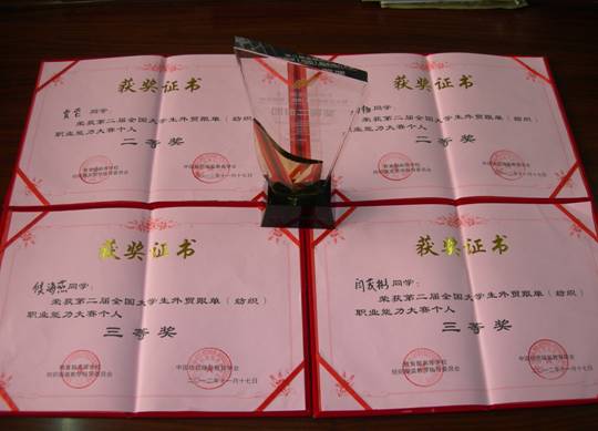 2012年11月16-17日,第二届全国大学生外贸跟单(纺织)职业能力大赛在东华大学举行。经过来自全国普通高校的23支代表队两天激烈的角逐,我院09级国际经济与贸易(1班)贾莹同学获个人二等奖;侯海燕同学获个人三等奖;我校代表队获得了团体二等奖的优异成绩。