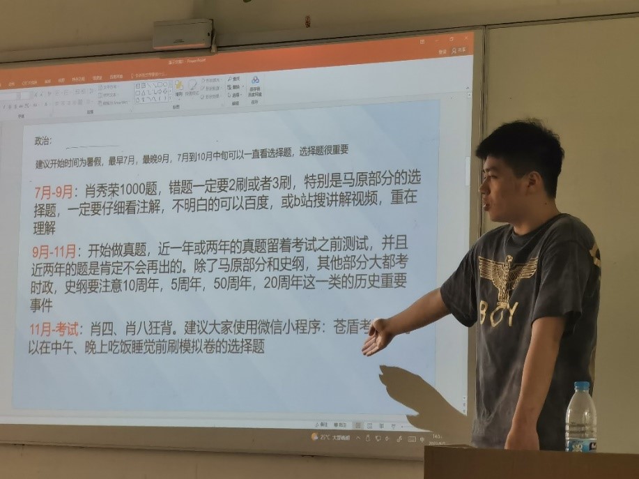 随后,李卓则首先分享了自己考研的成绩和录取院校,在院校的选择上提出了几点建议:在报考院校期间,一定要及时关注信息,以免影响重新选择。李卓立足于现在,为同学们分析了从七月开始的计划。在政治考试的准备中,李卓将时间划分为七月到九月,九月到十一月,十一月到考研期间三个不同阶段,并提出了每个阶段该做的题以及该关注的史纲。而对于英语考试的准备,李卓则重点强调了阅读的重要性,他认为第一遍做阅读的感觉很重要,一定要珍惜。关于数学的备,刘卓介绍了不同讲课老师的风格,并建议同学们选择老师要慎重,最好全程跟随一个老师,了解并适应老师的讲课习惯。最后,关于专业课的备考,刘卓建议从八月开始背,一定要多背,最终要达到滚瓜烂熟的程度。