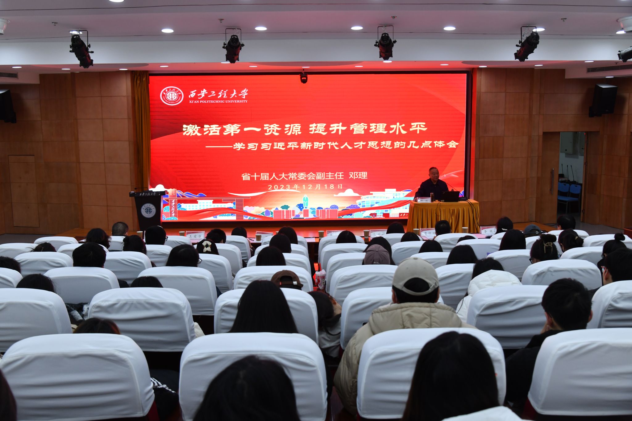 邓理围绕学习习近平总书记关于人才的重要思想,从激活第一资源,提升管理水平的角度,结合自身多年从事人才工作的经验,对“认识人才是激活人才和提升管理水平的前提;充分发挥人才制度基础性、长期性和稳定性的作用;坚持选人用人德才兼备、以德为先的原则和导向;用尊重人才的金钥匙打开激活人才的大门;以用为本,促进人人皆可成才,人人尽展其才”五个方面的思想理念进行了系统阐述。最后,他鼓励我院师生要在习近平新时代中国特色社会主义思想的指引下,努力学习、努力成才、努力施才,坚定信心、不辱使命,努力成为有理想、敢担当、能吃苦、肯奋斗的新时代好青年,为中国式现代化和陕西高质量发展做出无愧于时代的贡献。
