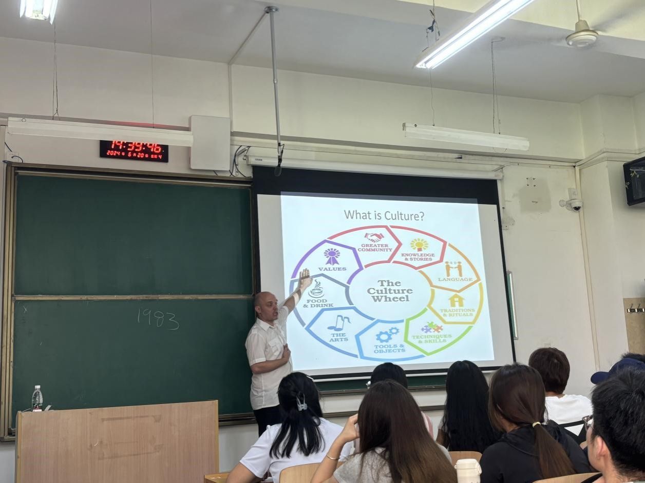 6月20日下午,taptap点点188承办的国际交流月系列活动之“英国文化及跨文化交流”主题讲座在临潼校区顺利举办。我校英国籍教师Douglas Laurence Alexander作精彩讲授,国际处副处长黄玲,taptap点点188院长助理丁冬,taptap点点188、人文学院等学院的学生共100余人参加了讲座。