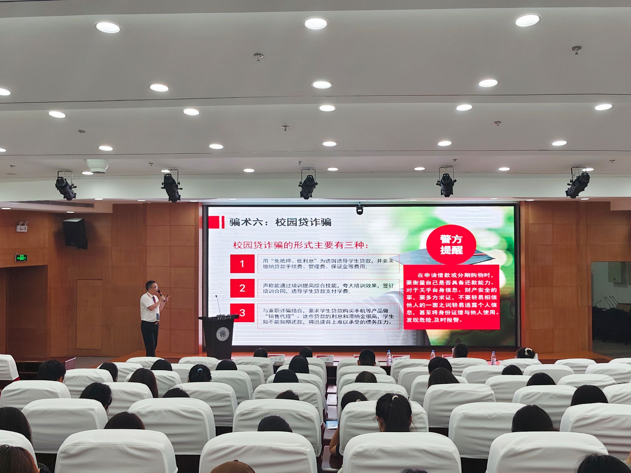 随后,武龙攀以《反诈知识进校园》为题,为在场师生带来了一场生动而深刻的宣讲。他结合工作中遇到的实际案例,以及我校学生自制的《以法为盾,护航青春》防诈骗短片,详细揭示了校园常见的诈骗手段和套路,提醒新生们时刻保持警惕,加强自我防范。