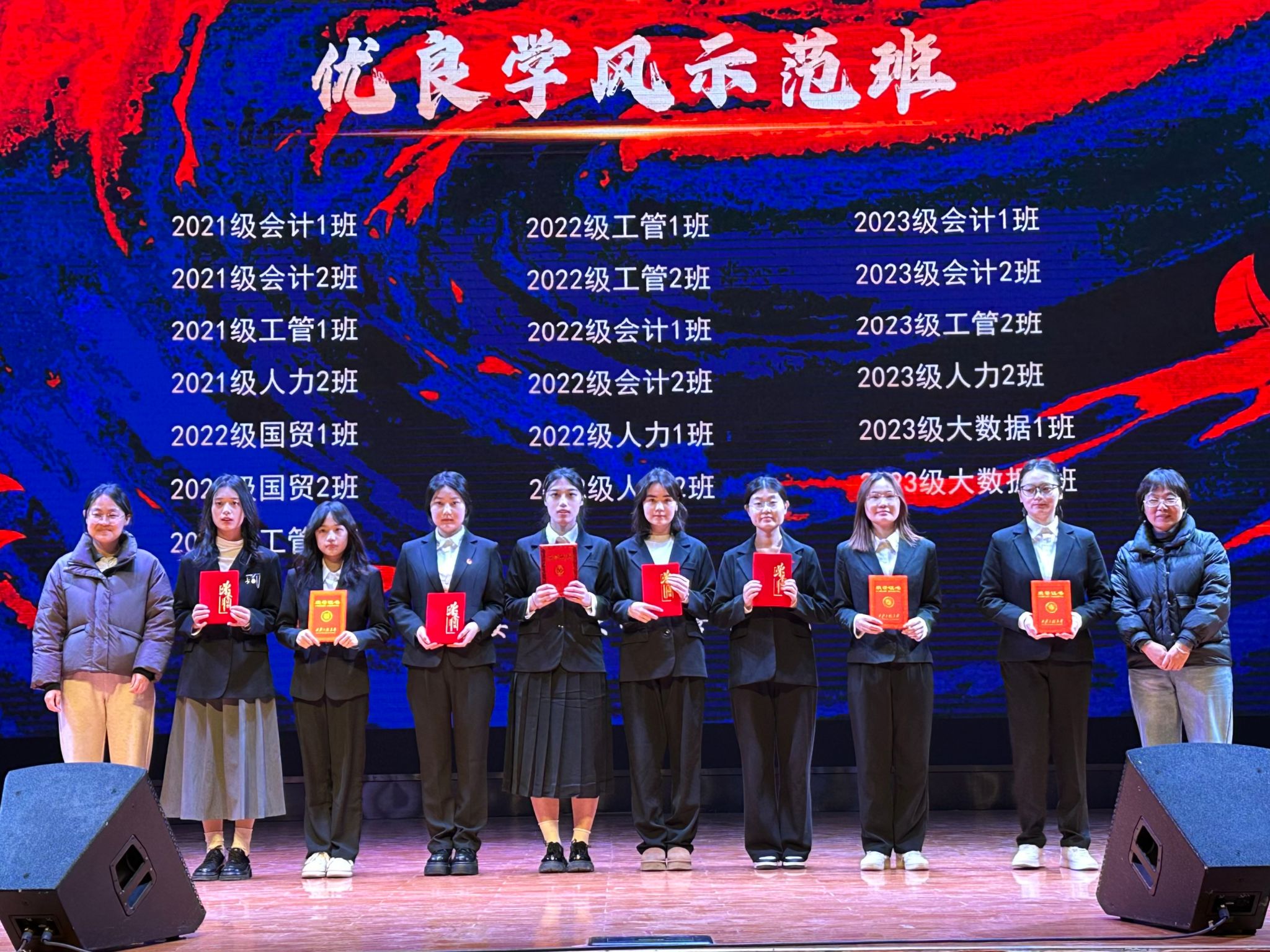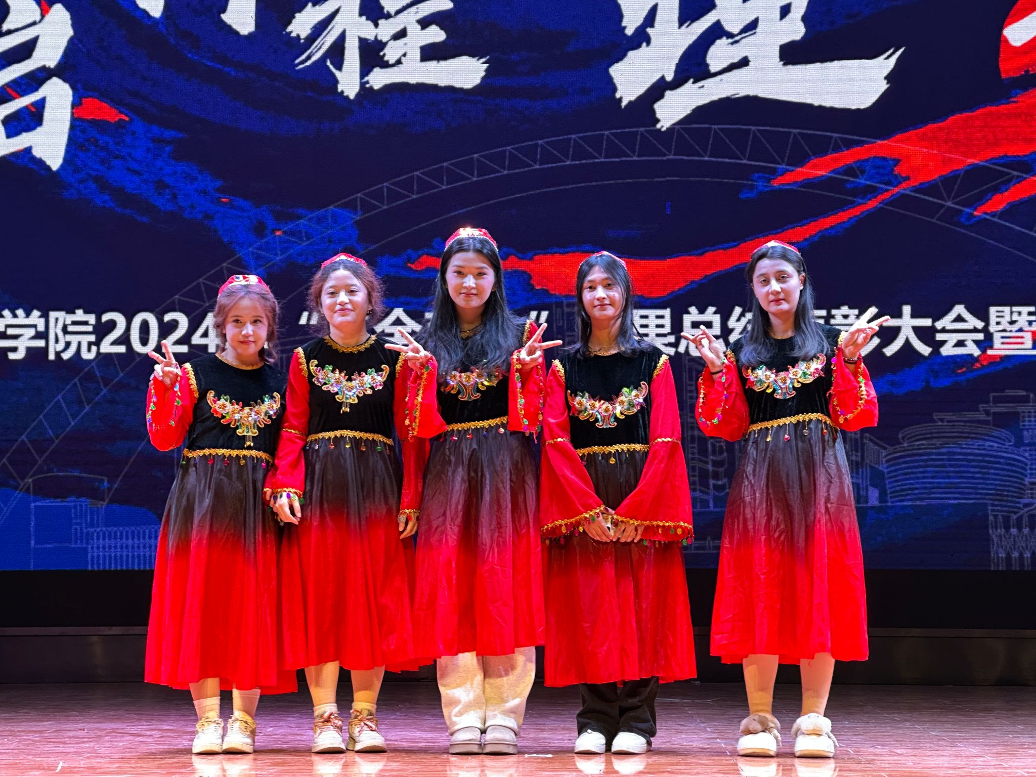 本次表彰大会共分为“立德篇”“勤学篇”“笃行篇”三个篇章,通过歌舞、朗诵、合唱等美育实践演出,展现了管院学子积极向上的青春风貌。其中,舞蹈《天山藏韵》以其独特的民族风情,生动诠释了“民族团结一家亲”的深刻内涵;师生朗诵节目《七十五载辉煌路,青春筑梦新征程》则深情回顾了新中国成立75年来的伟大历程,传递了师生对祖国的无限热爱与自豪。