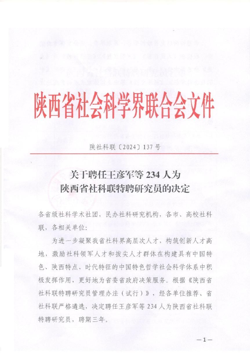 近日,陕西省社会科学界联合会公布了关于聘任特聘研究员的决定名单(陕社科联〔2024〕137号),我院王铁山、王保忠两位教师被聘任为陕西省社科联特聘研究员。