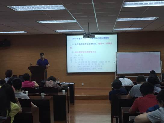 党总支书记邢瑞芳全面传达了校“三严三实”专题教育活动及“意识形态及大学生思想政治教育”动员大会的精神,包括“三严三实”的落实部署、党员作风建设,教育导向等。重点强调了师德建设工作以及行政管理人员转变工作作风的导向意见。
