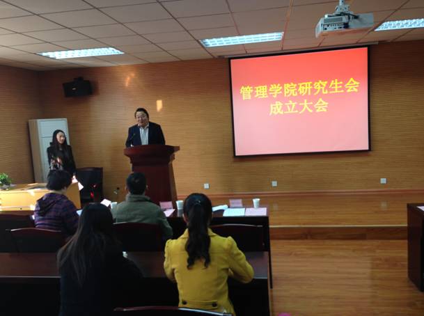 研究生会主席何倩倩代表第一届研究生会发言。她首先汇报了研究生会的筹备过程,并介绍了研究生会设立的组织机构及其主要职责。她代表第一届研究生会向在研究生会筹备过程中给予以大力支持和帮助的院领导、老师表示感谢!表示首届研究生会全体成员一定会开拓创新,踏实工作,为广大研究生办实事,为学院的发展添砖加瓦!
