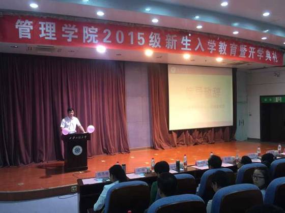 随后,教师代表工商管理系副教授潘颖雯老师发言,她对新生提出三点期望:一是心存高远,笃行目标,及早规划;二是珍惜时光,学会学习,学有所获;三是,开拓视野,全面发展,享受大学生活。最后,2013级信息管理与信息系统专业学生孙姝怡和2015级会计学专业张鹏同学分别代表在校生和新生进行了发言。