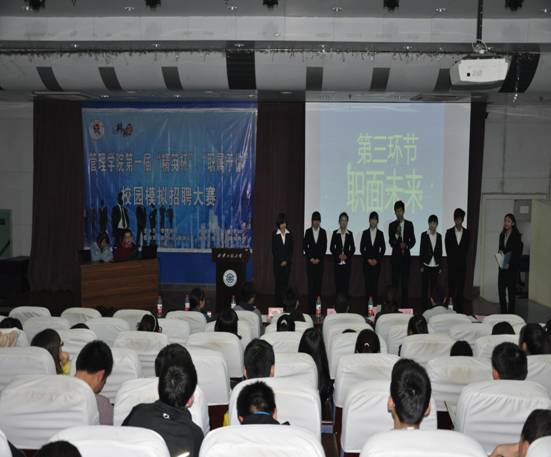 本次大赛分为初赛、复赛、决赛三个环节,主办单位精心准备,积极宣传,学生们踊跃参赛。经过两轮角逐后,七名学生从众多参赛选手中脱颖而出,进入决赛。决赛共分为三个环节:第一环节是职场亮剑,选手们通过各种表现形式自我介绍,力求突出自我优势,尽显自身亮点;第二环节是职我本色,选手们根据抽到的问题灵机地作答,模拟招聘双方的问题从形式到内容十分贴近职场实际,他们从容的问答更是展现了其良好的心理素质和综合能力。第三环节是职面未来,评委模拟用人单位招聘人员对选手进行提问。经过紧张、激烈的竞争,13级工管2班的陶萍荣获第一名,13级行政管理1班的鲍晓娟获得第二名,13级行政管理2班郭志娟荣获第三名。