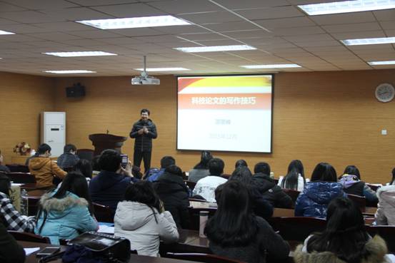 在报告中,邵博士主要介绍了“明确写论文的意义、了解学术期刊的相关知识以及把握论文的受众群”三个方面的内容。首先邵博士提出,科技论文所具备的实验性决定了它的独特作用,它有助于学生提高自身的专业综合能力、检验学校的教学效果。同时提醒老师、学生们,在发表学术论文之前应该对投稿指南所提供的信息进行剖析。接下来,邵博士总结了科技论文的写作技巧以及注意事项。从确定选题,到摘要的撰写,再到关键字、正文、参考文献、附录、致谢中应该注意的问题,邵博士提出了一个完整的“科学套路”。同时,他鼓励大家多写多投,不要在被拒稿的时候丧失科研信心,应该更加积极的投身于科研实践中,认真思考出版社在回稿中所提出的建议或意见,在反复的修改中提升科技论文的质量。