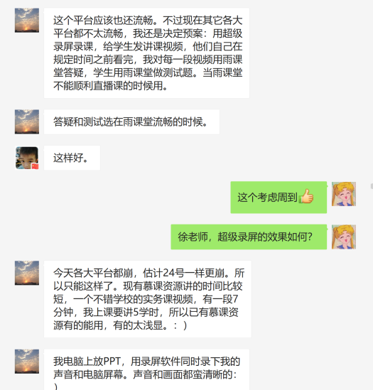(4)为防止网络出现拥堵等意外情况,徐玲老师、任惠斌老师提前录制好教学视频,并准备好充足的电子课件和作业,以备不时之需。