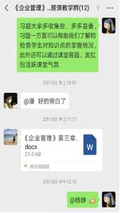 《企业管理》作为全校通识选修课,课程的最大特点就是人数较多,往往一个课头包含100名学生左右,因此,在线授课面临的最大难题就是如何带领好这百名学生跟上教学的进度,在直播中可以与他们形成良好的互动并得到及时的反馈。对此,老师们想出了各种办法,以下是课程组中各位教师教学经验的分享: