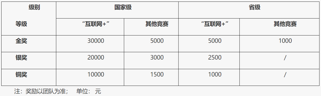 以团队形式参赛的赛事,以团队为单位发放奖励,由竞赛项目负责人分配奖金奖励;接受单人独立参加的赛事,学生奖金奖励按照奖励的50%核算。