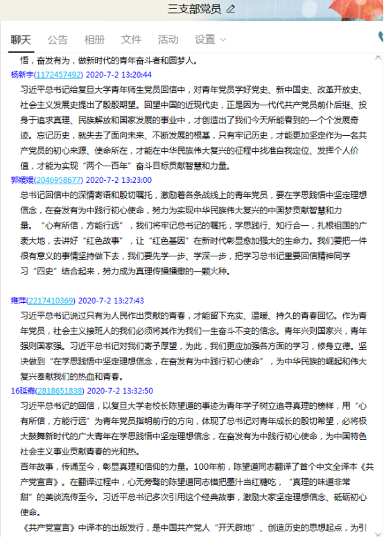 17级党员陈景秀说:在看完党课和习近平总书记的回信后,我感到深受鼓舞,倍感振奋,也感到使命责任在肩。我们贯彻落实习近平总书记重要回信精神的最好方式,就是传承红色基因、落实立德树人,坚守为党育人、为国奋斗的初心使命。我们要从自身做起,把“真理的味道”故事一代代讲下去,培养一代代“宣言精神”的忠实传人。