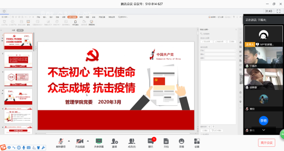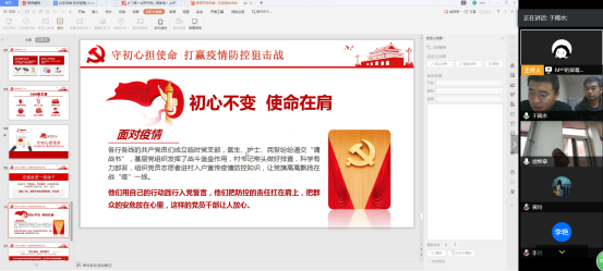 院长李艳结合自己的身份及工作开展情况,她表示,疫情面前凸显了中国共产党的执政能力和中国人民的团结,这也是发达国家不能达到的。开展线上教学,给我们提供了一种新的教学模式,近期要组织关于线上教学的研讨会,等疫情过去,要把线上教学的经验引入我们的日常教学工作中。其他成员也都谈了各自感受,纷纷表示,在近期和日后工作中,严格遵守学校的各项规定,坚定信心,立足岗位,同党和国家一起战胜这场防疫之战。