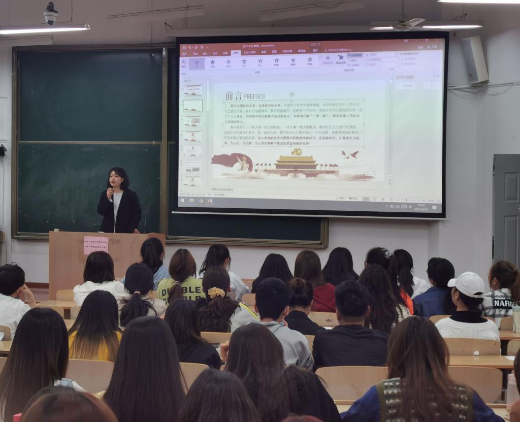 4月29日晚,taptap点点188党委在临潼校区B135开展党史学习教育暨支部书记讲党课第六讲,工商管理学生党支部书记陈钰娴以“学党史国史、育时代新人”为主题,为学院180余名党员和积极分子讲授党课。