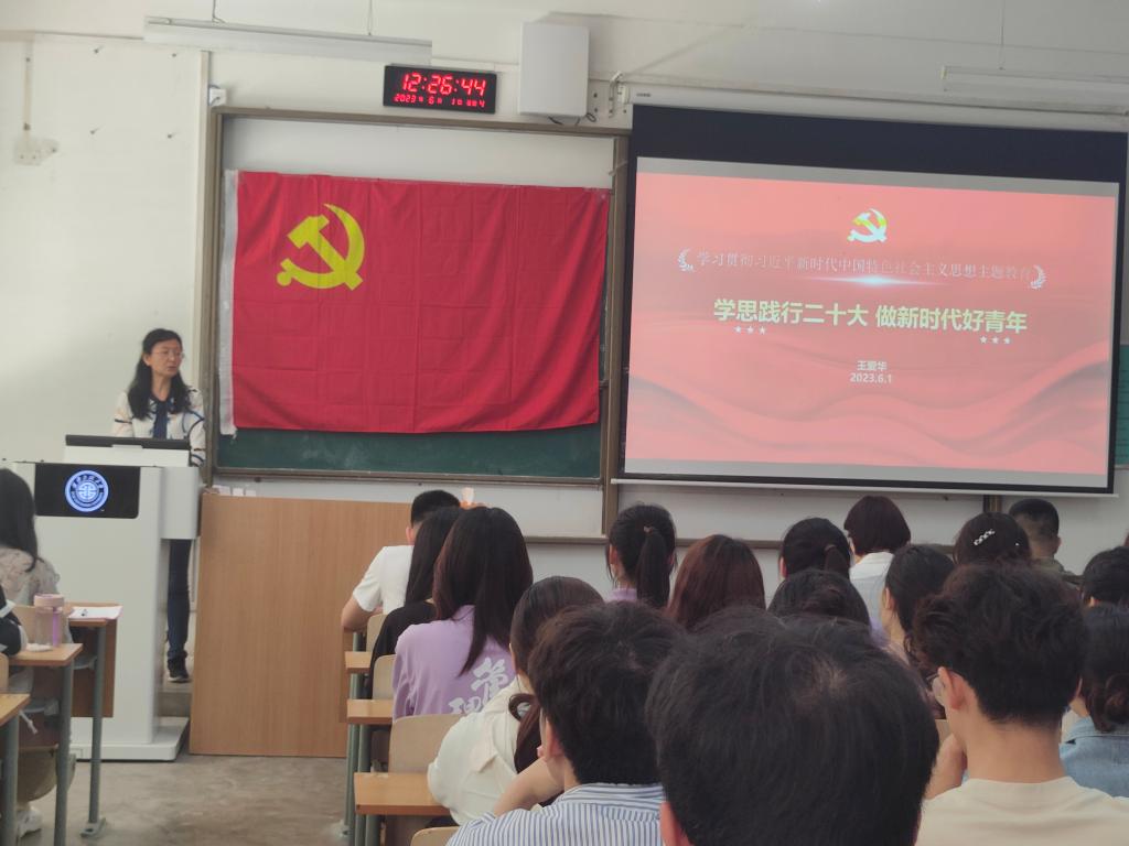仪式结束后,王爱华作开班第一讲——《学思践行二十大 做新时代好青年》。她带领同学们共同学习了党的二十大报告的主要内容,向同学们讲述了党的二十大报告中10个振奋人心的金话和11个引人关注提法,并对同学们提出了三点期许:一是要志存高远,努力做新时代具有远大理想和坚定信念的爱国者;二是要勤奋学习,努力做新时代具有过硬本领和高尚品格的建设者;三是要积极进取,努力做新时代具有责任意识和敢于担当的奋斗者。