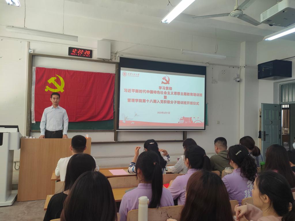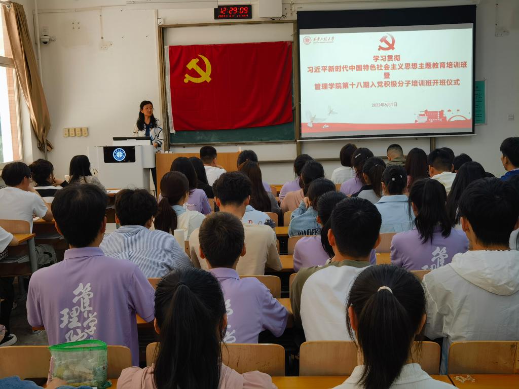 为深入学习贯彻习近平新时代中国特色社会主义思想,进一步加强对入党积极分子的培养、教育和考察,提高入党积极分子的思想政治素质,引导青年学生听党话、跟党走,争做有理想、敢担当、能吃苦、肯奋斗的新时代好青年,牢固树立为共产主义事业和中国特色社会主义事业奋斗终身的信念。6月1日中午,taptap点点188党委在临潼校区A-102教室举行学习贯彻习近平新时代中国特色社会主义思想主题教育培训班暨第十八期入党积极分子培训班开班仪式。学院党委书记王爱华,各学生党支部书记以及77名入党积极分子参加,会议由信息管理与信息系统学生党支部书记吴昌敏主持。