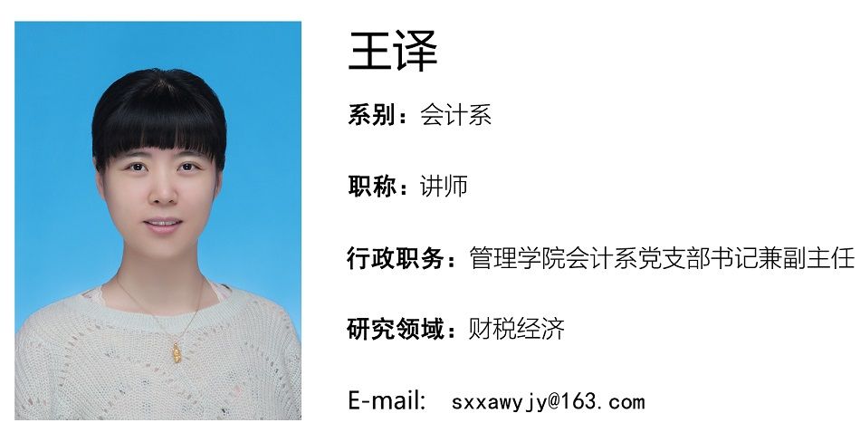 王译,女,会计系党支部书记兼副主任,讲师,MPACC导师,管理学博士。主持教育部人文社科青年项目、陕西省软科学基金项目、陕西省教育厅人文社科项目并参与多项国家省部级纵向课题研究。出版专著一部,参与完成一部教材编写,发表高水平期刊论文十余篇。